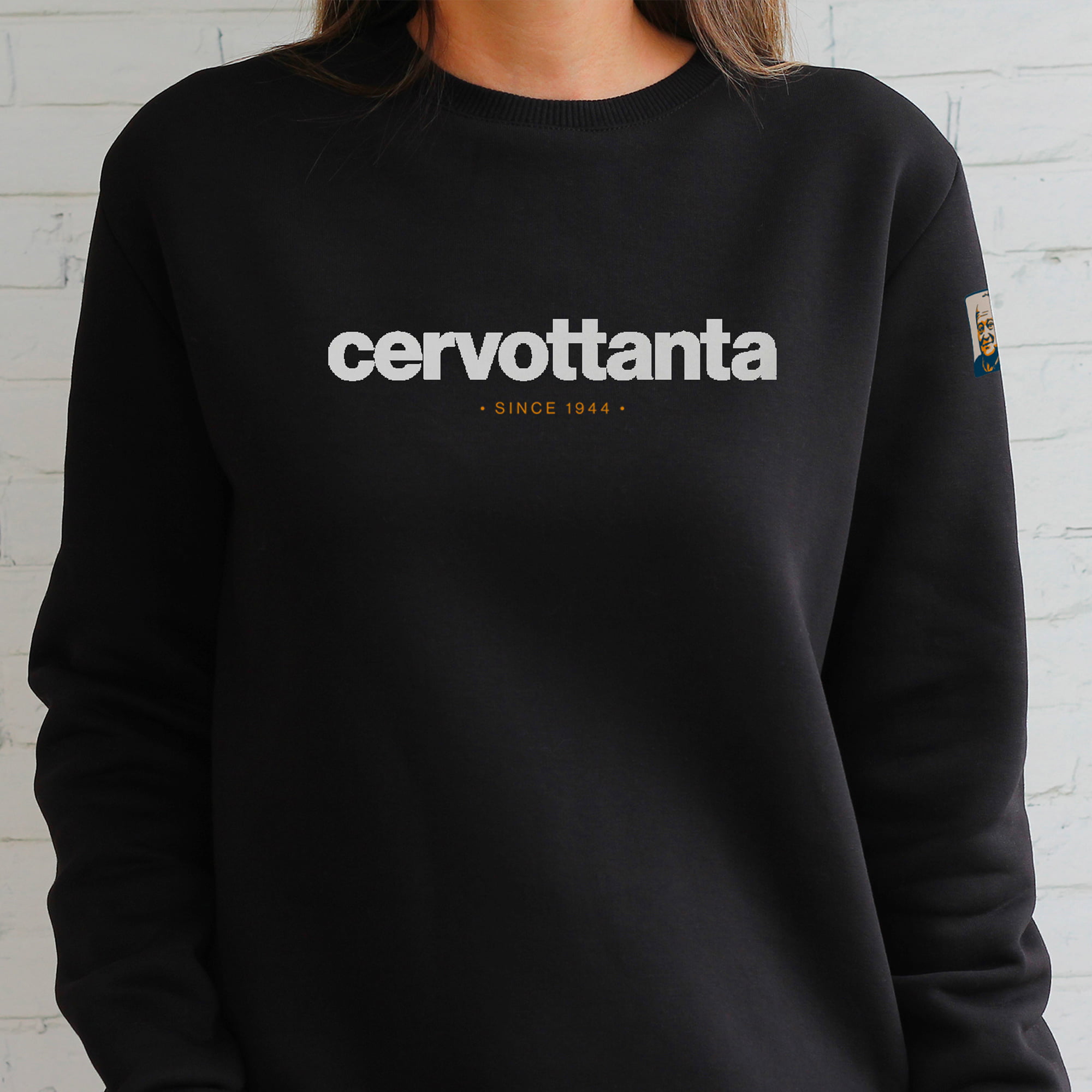 Felpa unisex con cappuccio di color nero. Morbida e dalle linee essenziali, con scritta CERVOTTANTA stampato sul petto e logo sulla spalla